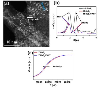 图2 1T-MoS2/SWNT杂化体系的原子结构表征:(a)1T-MoS2/SWNT的典型HADDF-STEM图片,显示MoS2纳米补丁分散在SWNT表面并且Mo原子显示明显地之字形链状结构,内嵌放大的图片显示Mo-Mo键长是2.75埃,扭曲1T结构的特征。(b)1T-MoS2/SWNT二次加权EXAFS振荡的傅里叶变换曲线。1T-MoS2和1T-MoS2/SWNT的(c)Mo K边的XANES谱