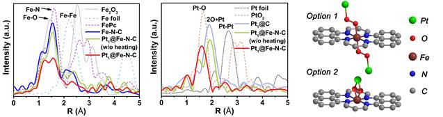 图1 使用北京同步辐射装置的XAFS解析Pt1@Fe-N-C催化剂结构。原始Fe-N-C的活性中心Fe原子和4个N原子配位并固定在C基底上,Pt原子通过一个O2分子嫁接在Fe原子上。