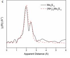 由于所制备的Mo3S13固体呈现无定形的结构,利用北京同步辐射装置(BRSF)X射线吸收谱技术对其结构进行了更进一步的表征,以了解Mo原子周围S原子的配位情况。比较电沉积Mo3S13 和(NH4)2Mo3S13·2H2O 的Mo元素K 边的X 射线吸收近边结构谱,二者吸收边没有观察到明显差别,说明二者结构中Mo元素周边的化学环境是基本相似的。再对电沉积Mo3S13和 (NH4)2Mo3S13·2H2O的Mo元素K 边的X射线吸收扩展边结构谱进行傅里叶变换,结果显示出Mo原子周围存在两个壳层,分别指向Mo-S结构相互作用和Mo-Mo结构相互作用。在电沉积的Mo3S13中,Mo-S壳层平均键长为2.44埃(表征键长2.0埃),配位数7.2;Mo-Mo壳层平均键长为2.73埃(表征键长2.4埃),配位数2.7。在(NH4)2Mo3S13·2H2O中,Mo-S壳层平均键长为2.43埃(表征键长2.0埃),配位数7.0;Mo-Mo壳层平均键长为2.75埃(表征键长2.4埃),配位数2.0。电沉积Mo3S13 的两个壳层和(NH4)2Mo3S13·2H2O的两个壳层平均键长和配位数相近,进一步证明了二者结构中Mo原子所处化学环境相似。由此确认电沉积得到的固体结构是Mo3S13。