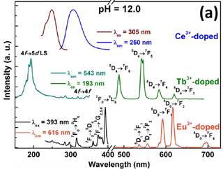 利用北京同步辐射装置(BSRF)真空紫外光谱线站(4B8-VUV)获得产物的真空紫外发光光谱。研究发现,通过掺杂不同稀土离子能实现发光颜色可调,晶体结构中OH-离子的浓度的增加,稀土离子配位环境的变化,造成稀土离子发光强度降低。这主要来自于NaxY(OH)yF3+x-y (0 < x < 1, 0 < y < 3)晶体结构中OH-基团较F-离子具有更高的能量振动模式。