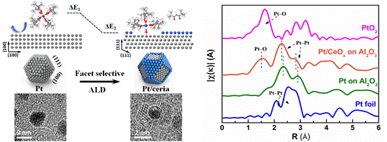 进一步,利用原子层沉积前驱体在金属颗粒表面不同晶面/位点的吸附能差异,能够实现具有氧化物晶面选择性包覆构型。研究发现,氧化铈优先在Pt(111)晶面生长,而暴露Pt(100)晶面形成一种具有纳米栅栏包覆式的催化剂构型。经过沉积过程中原位质量变化测试结合基于密度泛函的理论计算,证实这种晶面选择性原子层沉积生长方式源于铈源前驱体在Pt(111)和Pt(100)晶面的化学结合能差异。利用北京同步辐射装置(BSRF)1W1B-XAFS实验站发现氧化铈与Pt之间存在强烈的金属-氧化物相互作用。这种强相互作用和纳米栅栏构型提供的物理隔离限域作用大幅提升了金属Pt纳米颗粒在氧化性氛围下的高温热稳定性。