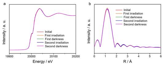 为了解析可溶性钼酸钠光催化剂材料中钼原子周边的本体原子级结构,该团队利用北京同步辐射装置1W1B线站的X射线吸收精细结构谱学技术表征对该材料的钼元素的K边吸收边进行了采集,并结合X射线衍射结果,所制备的光催化剂材料具有与钼酸钠本体化合物相类似的几何结构。为进一步研究溶解部分钼酸钠材料的可能电子结构与本体原子级结构,该团队用原位X射线吸收精细结构谱学表征对上述未饱和钼酸钠溶液进行了测试,结果说明在光辐照以及在黑暗条件下的钼元素的局域本体原子级结构没有发生任何变化。原位X射线吸收精细结构谱学表征说明,钼酸钠溶液不会对紫外光辐照有所响应,说明材料活性部分就是未溶解部分的钼酸钠光催化分解水光催化剂材料。