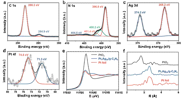 利用北京同步辐射装置(BSRFX射线吸收谱技术获得的图谱进一步确定。Pt1Ag24/g-C3N4的白线峰强度接近Pt箔,表明催化剂中大部分的Pt原子以金属态Pt0存在。Pt1Ag24/g-C3N4仅在2.0~3.0埃存在明显的峰,这一现象表明样品不存在PtC/N~1.5 埃)或PtO成键,Pt原子在退火过程之后,仍然包覆在Ag中进一步说明了Pt原子存在Ag团簇中这种特殊的合金结构。