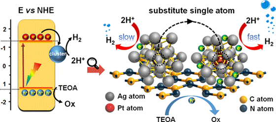 g-C3N4作为一种廉价的聚合物半导体,由于其出色的稳定性,合适的能带结构,制备方法简易等特性,被认为是最具潜力的光催化材料。然而就单纯的g-C3N4而言,通常表现出较快的载流子复合速率,有限的吸光性能等缺陷。这也导致了其较差的光催化分解水产氢活性。这些缺陷通常可以通过负载助催化剂来进行改善。华东理工大学的一个研究组合成了高纯度的Ag25(SR)18Pt1Ag24(SR)18两种贵金属团簇作为研究对象,将其作为助催化剂负载在g-C3N4上,构筑了新的光催化体系。首次将精确原子数金属团簇和单原子合金的概念引入到光催化助催化剂的设计中,相关的研究成果发表在2017627日的《Chemical Communication》上。