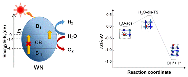 氮化钨材料的光催化反应可能路径图和其分解水反应过程中吉布斯自由能的变化曲线。理论上从B-1到CB的最小带内跃迁跨度值是4.7eV,这意味着可用来光催化分解水的最长波长是264nm,与实际条件不符。幸运的是,从CB到B1的带内跃迁跨度值满足氮化钨材料实现765nm光照射下全分解水的条件。另外,吉布斯自由能曲线变化趋势说明氮化钨光催化分解水过程为放热反应。