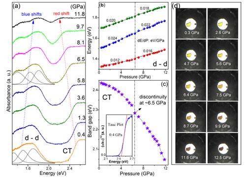 常压下,[NH3-(CH2)4-NH3]CuCl4的带隙约为2.45eV,因此材料呈现黄绿色。在12GPa以下,当压力增大时,CT吸收峰出现红移,材料颜色由黄色变为红棕色再变为黑色,带隙由2.44降至2.05eV,表明在压力调控下,带隙变窄。在压力达到6.5GPa附近时,带隙出现了不连续的变化,意味着材料由室温相变到了高压相。[NH3-(CH2)4-NH3]CuCl4是间接带隙,且在高压下未发现带隙类型的转变。与其他短链有机金属钙钛矿材料相比(如CH3NH3PbBr3),[NH3-(CH2)4-NH3]CuCl4由于其更好的稳定性,在12GPa以内出现了带隙持续变窄的现象。[NH3-(CH2)4-NH3]CuCl4在高压下带隙窄化能提高其电导率以及作为太阳能电池应用时的电荷转移性质。