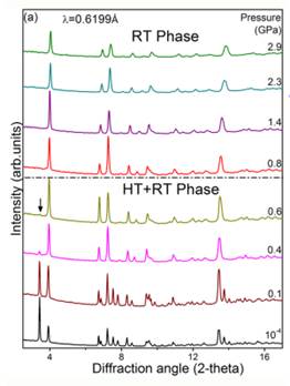 为研究[NH3-(CH2)4-NH3]CuCl4的高压行为,该课题组在北京同步辐射(BSRF4W2-高压实验站进行了高压XRD实验。样品在研磨时不可避免地转变成室温相与高温相的混相。压力增大到0.8GPa时,混相变为纯室温相。相变的转变是由有机链决定的,相变后分子层间距离减小,无机层间隔变大。转变过程中,有机层在无机层中起着类似弹簧垫片的作用,增加了结构的稳定性。继续加压,在6.410.5 GPa范围内,衍射峰出现了显著的变化:(1 1-1)峰在6.4GPa时劈裂;在7.710.5 GPa时,(001)峰附近分别出现了新的衍射峰。表明在此压力范围内晶体由室温相转变为高压相。相变压力范围持续了约4GPa,表明两个相之间的能量相差较大。所有的变化均出现在(1 1-1)(001)处,表明相变是由无机部分的变形引起的。