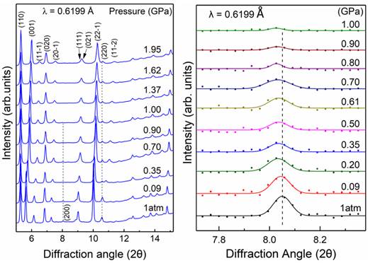为研究硫氰酸钴吡嗪的高压行为,该课题组在北京同步辐射(BSRF4W2-高压实验站进行了高压XRD实验,实验最高压力为1.95GPa。图2是硫氰酸钴吡嗪晶体的XRD谱在高压下的变化。从图中可以看出,随着压力的升高,(200)衍射峰向低角度方向移动,表明(200)面间距随着压力的增大而增大。晶体沿垂直于面(200)的方向负压缩。对XRD谱进行精修,结果表明晶格参数β随压力增大而减小。进一步分析表明晶体内部分子层间的滑移效应导致了β的减小,进而使得a轴在垂直于(200)面的方向上投影变大,在该方向上出现了负压缩。
