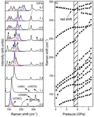 为研究Ni-Bz局部结构在高压下的变化,该课题组进行了高压拉曼研究。对于Ni-Bz,ν(NH3)模式的位置可以用来判定Ni-Bz的主客体体系是否发生了分解。在1.1 GPa—5.0 GPa之间,新的ν(NH3)振动峰出现,并逐渐增强,而原有的振动模式则逐渐减弱至最后完全消失。这意味着,在此压力区间内,客体苯分子逐渐的脱离了主体框架,即发生了去组装过程。当客体分子完全脱离主体框架之后,主体失去客体的支撑,平面结构被破坏,发生5.0—6.0 GPa的相变。