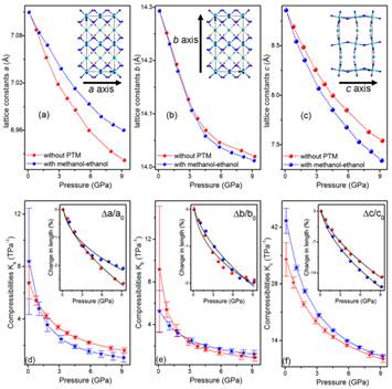 为了探索Hofmann包合物中去组装过程是否在高压是可逆的,即高压是否可以导致主体框架和“外界”客体分子之间的组装过程,该课题组对Ni基Hofmann包合物对应的主体框架Ni(CN)4Ni(NH3)2?0.5H2O(Ni-Ni)进行了高压同步辐射实验,通过不添加、添加不同“外界”客体分子两种情况的实验,对比探索该物质在高压下的结构行为,主客体组装关系变化的差异。获得更多的压力对主客体组装调制,客体对主体框架的影响等方面的具体信息。如果在高压下“外界”ME可以进入主体孔隙,在有客体分子支撑的情况下,层间的压缩会更难。在以醇分子作为“外界”客体分子的的情况下,a轴的收缩被抑制,而层间结构的压缩反而更为明显,实验现象则表明,高压下小分子ME并未进入到Ni-Ni的孔隙中