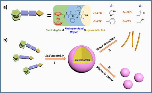 该课题组研究发现,两亲性的二茂铁-三肽能够在水相/有机相界面处排列成特殊构型,进而组装形成纳米乳液。该纳米乳液的粒径可控,通过简单调节水相/有机相比例,就可使乳滴粒径由微米级变为纳米级。纳米乳液能够在25 下稳定保持四个月以上,并且在70 高温下也能维持乳液状。另外,在低于25 环境下,纳米乳液还能够发生熵驱动的相转变,自发转变成为具有三维网状纳米纤维结构的水凝胶。