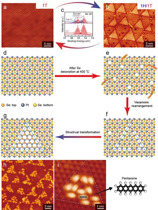 中科院物理研究所高鸿钧院士领导的联合研究团队在新型二维原子晶体材料及其功能化的研究中获得了突破性进展[Nature Materials 16, 717 (2017)]。他们发展了一种构建纳米级精准规则图案的方法,首次构筑了两种基于过渡金属硫族化合物的纳尺度的自然图案材料:一种是具有交替三角形拼图图案的1H/1T型单层二硒化铂(1H/1T-PtSe2),另一种是具有周期排列三角形孔洞的单层硒化铜(CuSe)。进一步将分子和原子分别沉积到这两种材料表面的实验显示这两种二维原子晶体材料具有选择性功能化的特性。单层二硒化铂(PtSe2)具有两种构型,八面体型(1T)和三棱柱型(1H)。在此工作之前,2015年该研究组利用直接硒化 Pt(111)基底的方法,制备出了高质量半导体性质的1T型单层二硒化铂(1T-PtSe2)单晶薄膜[Nano Lett. 15, 4013 (2015)]。在此工作基础上,他们通过对1T型单层二硒化铂薄膜(1T-PtSe2)进行退火处理(基底400),使其表面形成硒原子空位缺陷,空位缺陷重新排列得到了三角形图案化的1H/1T-PtSe2单层薄膜。进一步对1H/1T-PtSe2薄膜补充硒原子并在较低温度下(基底 270) 退火,可以获得纯的1T-PtSe2薄膜,从而实现了1H/1T-PtSe2薄膜和1T-PtSe2薄膜之间的可逆转变。1T结构具有半导体性质,1H结构具有金属性质;1T/1H结构之间的界面原子级平整,可提供未来器件应用中理想的金属-半导体结构。此外,类似于传统半导体中的掺杂工艺,可以使半导体1T区域表现为电子富集(N型)或者缺乏(P型)。比如,沉积的并五苯(C22H14)分子只吸附在1H区域,这可能会改变这些金属性的区域,由此导致相邻的半导体性1T区域的电子增加或者减少,即实现掺杂。为了验证该材料潜在的功能化特性,他们将并五苯(Pentacene)分子沉积到1H/1T-PtSe2表面,发现并五苯分子选择性吸附在三角形的1H-PtSe2区域。