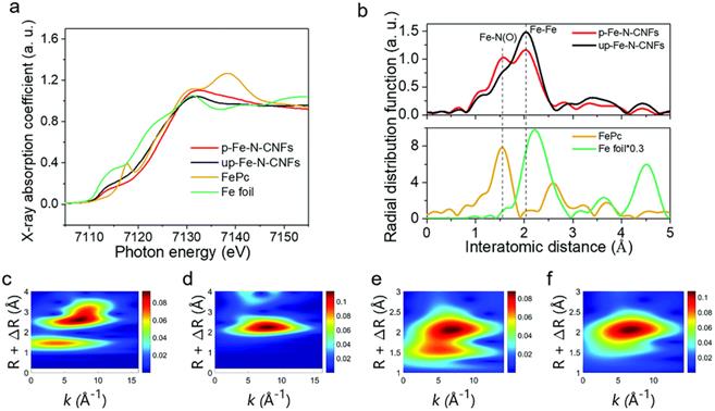 该课题组在北京同步辐射装置1W1B-XAFS实验站上采集了Fe的K边XAS谱,利用XANES和EXAFS分析,从结构上证明了该催化剂在SiO2保护壳下,不仅可以限制Fe活性位点的迁移,而且还限制了高温热解过程中挥发性气态物质的捕获,同时优化了Fe-N-CNFs催化剂的表面官能和多孔结构。与没有SiO2保护壳制备的催化剂相比,Fe-N-CNFs催化剂在酸性介质中具有显着提高的ORR活性和优异的稳定性。相关文章“SiO2-protected shell mediated templating synthesis of Fe-N-doped carbon nanofibers and their enhanced oxygen reduction reaction performance”发表在Energy Environ. Sci.上(Energy Environ. Sci., 2018, 11, 2208-2215)。