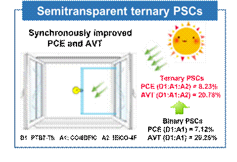 半透明太阳能电池(PSCs)由于其在建筑光伏等领域的潜在应用而受到广泛关注。功率转换效率(PCE)和平均可见透过率(AVT)是半透明PSCs的两个主要参数。PCEAVT之间通常存在竞争关系,如何同时提高半透明PSCsPCEAVT是一个很大的挑战。本北京交通大学张福俊课题组以窄或超窄带隙材料为活性层,制备了半透明三元PSCs。半透明三元PSCsPCEAVT可以同时得到改善,这在其他文献中从未报道过。他们首先以100 nm银为电极,在不透明PSCs中优化了第三组分IEICO-4F的含量。通过在受体中加入15% wt% IEICO-4F,不透明PSCsPCE提高到11.94%,其短路电流,开路电压和填充因子均得到优化。一个有趣的现象还被观察到:三元混合薄膜的吸收边和比两种二元混合薄膜的吸收边相比明显地红移。近红外区域光子捕获的增强将有助于性能的提高,特别是对于没有AVT损失的半透明PSCs。在不透明PSCs的最佳实验条件基础上,他们以15nm银为电极,制备了导电率和透射率相对平衡的半透明PSCs。与基于PTB7-Th: COi8DFIC的半透明二元PSCs相比,半透明三元的PCEAVT同时提高到8.23%20.78%