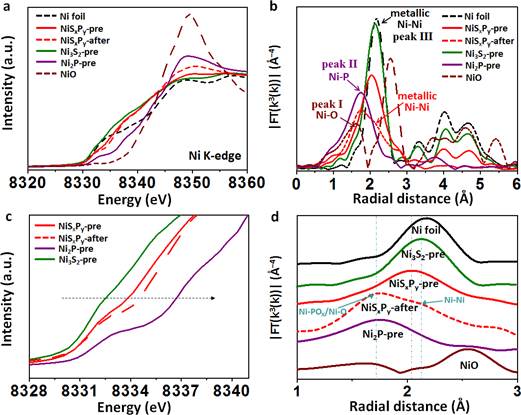利用北京同步辐射装置(BSRF)对NiSxPyNi组分在反应前后价态以及配位环境的变化进行分析。首先,从Ni K-edgeXANES谱图可以看出(图ac),标准样品NiO的白线峰强度最高,Ni foil的最低。吸收边能量说明NiSxPyNi的价态处于Ni3S2Ni2P中间。析氧反应后,所有样品中Ni的价态升高,证明反应过程中样品发生氧化;另一方面,NiSxPyNi的价态仍然比反应前Ni2P的低,该现象表明样品体相仍保持金属性。同时,通过Ni元素扩展X射线吸收精细结构谱(EXAFS)得知(图bd),峰I1.61 )属于Ni-O成键,峰II1.76 )属于Ni-P成键,峰III2.15 )属于Ni-Ni成键。NiSxPy中主峰位置为2.0 ,据分析该峰主要来自Ni-Ni的反向散射,部分属于Ni元素与非金属元素的成键(OSP)。析氧反应结束后,NiSxPy1.732.14 处出峰,其中前者表明Ni与邻近OP配位(Ni-ONi-POx),进一步证明了Ni被氧化;后者说明Ni-Ni键仍然存在,证明体相保持良好的金属特性。