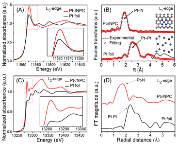 利用北京同步辐射装置(BSRF,1W1B线站)获得Pt1/NPC样品的X射线吸收光谱(XAS),研究单原子铂的配位化学结构。图A显示了样品的Pt L3边归一化XANES光谱。可以看出,单原子Pt样品的白线(WL)强度明显高于Pt foil的WL强度,说明相比于Pt foil,单原子Pt有更多未被占据的5d轨道(5d5/2或5d3/2)。此外,EXAFS–FT曲线用于分析单原子Pt的原子配位结构。如图B所示,Pt foil在~2.59埃处显示出金属铂的Pt–Pt键,而Pt1/NPC没有表现出这种Pt–Pt键的特征峰。但Pt1/NPC在~1.93埃处显示出归属于Pt–N键的峰,说明Pt原子与N原子键合。此外,Pt L2边光谱可以提供更多关于电子轨道水平上Pt–N键形成的信息。如图C和D所示,与Pt foil的L2边相比,Pt单原子也具有高得多的WL强度。此外,对于Pt1/NPC,明显的Pt–N键存在以及Pt–Pt键的消失,这些结果与L3边得到的结果一致。然而,如图C所示,在L2边缘处记录的Pt foil的WL强度非常弱,而在Pt1/NPC中单原子Pt的WL强度非常强,这说明相对于5d3/2轨道充满的金属Pt来说,单原子Pt具有更多的空5d3/2轨道,来接受Pt 2p1/2轨道的电子跃迁。因此,单原子Pt中更多未填充的Pt 5d3/2轨道,可能与Pt1/NPC中Pt–N配位形成有关。为了更有力地证明Pt1/NPC中形成了Pt–N4键,利用图B插图中所示的用Pt–N4结构模型,做了EXAFS数据拟合。在R空间从1.5到3.5埃的范围,Pt原子的第一壳层的拟合曲线与实验数据十分吻合,进一步证实了Pt1/NPC中Pt–N4键的形成。同步辐射技术很好地帮助了我们,从原子层面了解活性中心的化学配位结构,是一种表征纳米材料物理化学结构的有效手段。