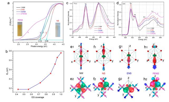图1. NEXAFS表征乙二醇配体诱导的TiO2纳米片表面轨道重构机制。