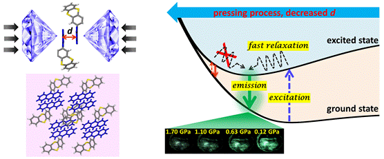 单晶X射线衍射(X-Ray Diffraction, XRD)方法可以明确地观察分子构型及堆积结构,但是这种属于基态下的结构,并不能直接反映出激发态结构。时间分辨单晶XRD方法使激发态结构研究迈向新的台阶,其原理是在样品处于激发态时测定二聚体的构型,然而这种研究手段要求晶体具有强的衍射和长的寿命(磷光,寿命为毫秒级),对于有机小分子激基缔合物(寿命通常为纳秒级)面间距离的测量是难以实施的。该课题组研究的具有离散蒽二聚体堆积的晶体,在金刚石对顶砧(Diamond Anvil Cell, DAC)产生的高压下表现出独特的发光行为:压强小于1.70 GPa时,发射波长表现出压强的非依赖特性;压强大于1.70 GPa时,发射波长逐渐红移。