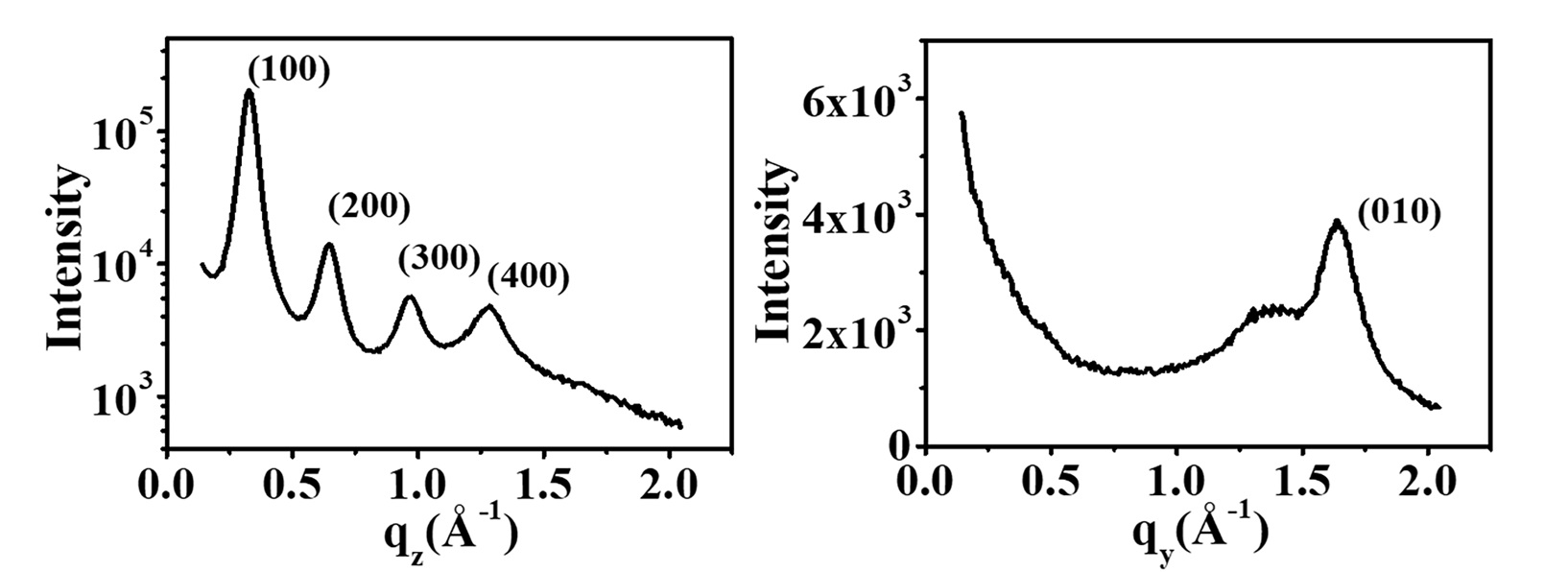 为研究聚合物光电性能提高的原因,在北京同步辐射装置1W1A-漫散射实验站的帮助下,研究人员利用一维GIWAXS表征了聚合物薄膜有序性(图1),发现含氢键结构的共轭聚合物具有较强的XRD信号,其在面外方向显示(X00)堆积信号,为沿侧链方向的有序堆积,在面内方向显示(010)堆积信号,为沿主链方向的π-π堆积。这些结果表明聚合物在衬底上呈现edge-on的堆积方式,这对电荷传输是有利的。此研究结果为聚合物侧链的研究提供了新的思路,该工作发表在《Chemistry of Materials》上 (Chem. Mater. 2019, 31, 1800)