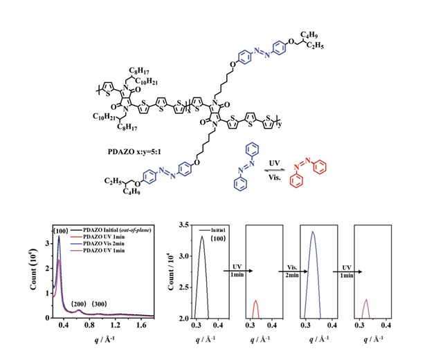 为研究聚合物电荷传输性能变化的原因,在北京同步辐射装置1W1A-漫散射实验站的帮助下,研究人员利用一维GIWAXS表征了聚合物薄膜有序性随紫外和可见光照的变化(图2),发现在面外方向,聚合物呈现(X00)的侧链方向堆积。当原位紫外光照时,其信号明显降低,进一步可见光照后,其信号恢复为初始态。而面内方向其信号保持不变。这一研究表明:偶氮苯随紫外/可见光照的异构化反应导致侧链堆积发生可逆性变化,从而导致聚合物分子链间传输受到可逆性的调控。结合理论计算,偶氮苯基团的引入,导致分子内和分子间的电荷传输发生可逆性变化。此研究结果为功能化聚合物的研究提供了新的思路,该工作发表在《Advanced Functional Materials》上 (Adv. Funct. Mater. 2019, 29, 1807176)