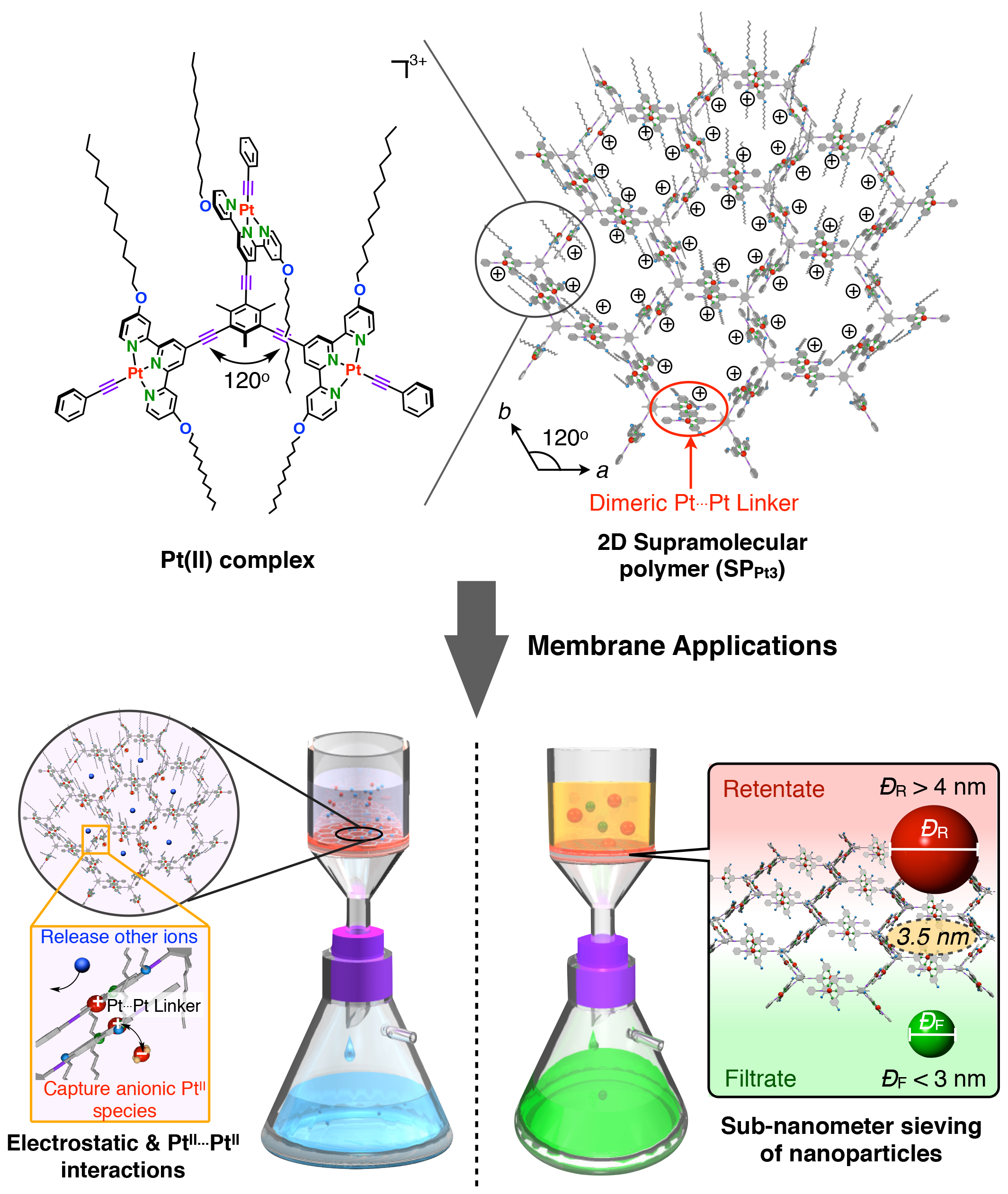 从废水中回收贵金属铂是一项兼具环保和经济价值的任务。目前,能够实现针对铂的高选择性是非常困难的,因为它与钯、金、银等其他贵金属具有某些相似的化学性质。作者所制备的二维超分子聚合物是由带正电的三联吡啶铂配合物组装形成,显示出独特的“铂···铂”非共价键相互作用。正是凭借这类铂自身的相互作用和静电吸引,四氯铂酸根阴离子会很容易在过滤中被超分子聚合物膜捕获;相反,其他金属离子会非选择性地快速渗透通过膜孔,最终实现对铂的高效分离回收。在上述工作基础上,研究人员还进一步探索了该膜材料对于不同纳米尺寸粒子的分离。由于二维超分子聚合物内存在均一且平行取向的纳米空腔,该复合膜在截止尺寸约4.0nm精度上显示出高的尺寸选择性。理论上讲,该膜可分离的粒子种类是不限的,包括量子点、贵金属和金属氧化物。研究人员结合该超分子膜和过滤分离,不仅仅提高了纳米粒子的红光发光纯度和尺寸单分散性,而且还能够快速去除难以被磁体捕获的较小磁性粒子吸附剂,从而扩展了它们在许多领域中的潜在应用。