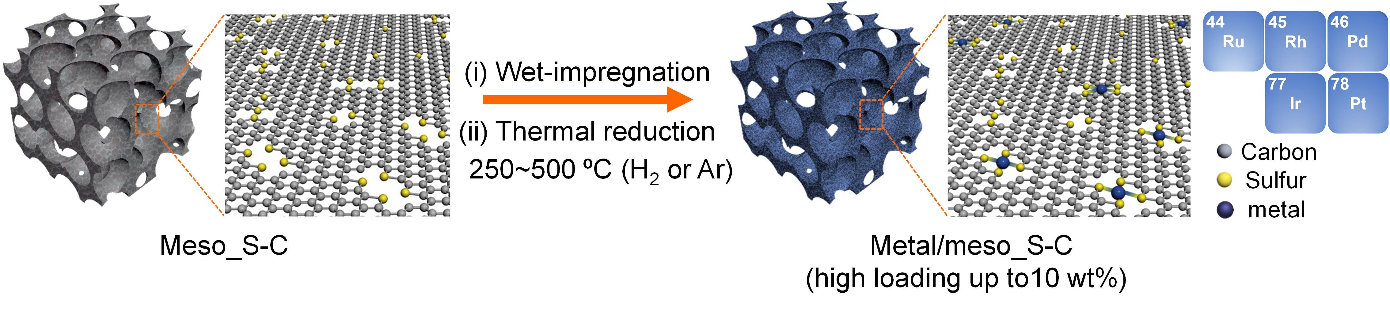中国科学技术大学梁海伟教授课题组与林岳老师以及快盈v3储胜启副研究员合作,使用高比表面积硫掺杂介孔碳(meso_S-C)为载体,基于贵金属与硫之间的强键合作用原理,制备出一系列高载量原子级分散贵金属催化剂,包括Pt、Ir、Rh、Ru以及Pd,其中金属Pt的载量可以达到10 wt% (如图1)。该研究成果发表在《Science Advances》上(Sci. Adv. 2019, 5: eaax6322)。在该工作中,研究人员首先利用他们前期发展的过渡金属催化碳化有机小分子的方法(Nature Communications 2015, 6, 7992;Science Advances 2018, 4, eaat0788),合成了具有高硫含量(~14 wt%)和高比表面积(>1200 m2 g-1)的meso_S-C载体,并利用传统的浸渍法在该载体上成功制备出5种原子级分散的贵金属催化剂。