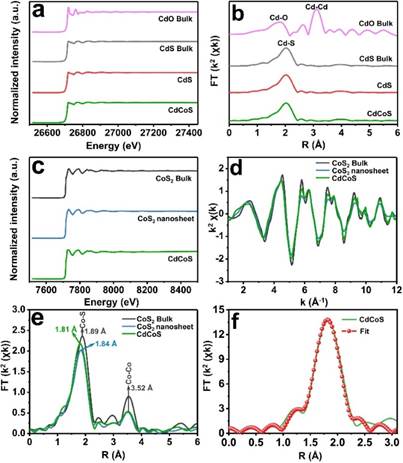 课题组利用北京同步辐射装置(BSRF)1W1B-XAFS实验站的X射线吸收谱测量得到了定量的结构参数。首先研究了Cd的电子结构和局域原子排列,进一步探究了CdCoS(CdS/CoS2)的界面微观结构。合成的CdS纳米线和CdCoS的光谱相似,边缘位置和整体光谱特征与块状CdS几乎相同。这一结果表明CdCoS异质结中的CdS具有与CdS纳米线非常相似的局域原子结构,CoS2纳米片对CdS组分的化学结合性质影响不大。CoS2纳米片和CdCoS的Co-K边缘位置与参考的CoS2一致,表明样品中Co原子周围的局部结构与本体CoS2中的Co-S八面体结构相似。CoS2纳米片和CdCoS的Co-K边缘k2χ(K)振荡曲线与块体CoS2相比有明显差异,相应的傅里叶变换(FT)k2χ(K)函数也进一步验证CoS2纳米片和CdCoS的Co-S峰向低R方向移动,且强度明显降低,定性地揭示了它们独特的局域原子排列。同时,三种样品的Co-Co峰均无明显差异。最后,最小二乘曲线拟合结果表明,CoS2纳米片中Co-S的配位数明显从6减少到5.1,CdCoS的配位数包含了属于CdS的S原子,并从5.1增加到了5.8。由此得到了配位数接近CdS和CoS2之间的真实过渡层。