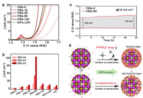 2. a)不同催化剂的OER极化曲线;(b)不同催化剂的电流密度对照;(cPBA-0PBA-60催化剂的OER稳定性测试;(dPBA-0PBA-60催化剂的OER表面重构示意图。