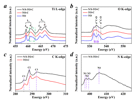图1 (a)Ti L边,(b)O K边,(c)C K边和(d)N K边的XAS谱图