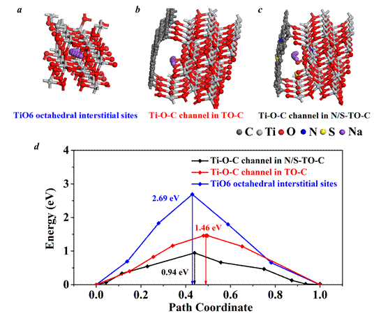 图2 Na+在(a)TiO6八面体堆垛成的间隙通道,(b)TO-C的Ti–O–C通道以及(c)N/S-TO-C的Ti-O-C通道中的扩散路径;(d)Na+在上述储钠通道中的扩散能垒