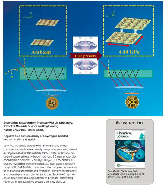 Guoqiang Feng, Wei-Xiong Zhang, Liyuan Dong, Wei Li,* Weizhao Cai,* Wenjuan Wei, Lijun Ji, Zheshuai Lin,* Peixiang Lu*, Negative Area Compressibility of a Hydrogen-Bonded Two-Dimensional Material, Chem. Sci., (10)2019, 1309–1315.