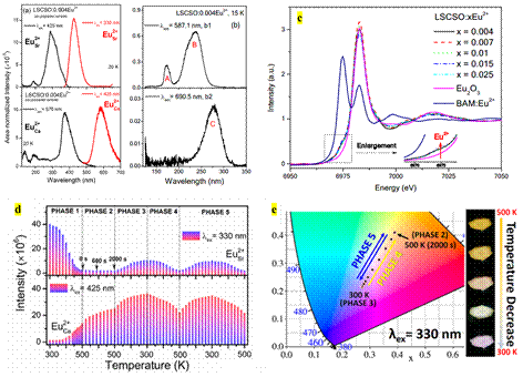 借助北京同步辐射装置(BSRF) 4B8-真空紫外光谱实验站提供的光源条件,研究人员分析了占据不同格位Eu2+的4f-5d跃迁在真空紫外-紫外波长范围的光谱,发现占据Sr2+和Ca2+格位的Eu2+, 其4f-5d跃迁波长分别位于425及570 nm。同时,借助BSRF 1W2B-衍射谱学综合实验站测定的X射线吸收精细结构谱,发现在Eu2+掺杂样品中存在未被还原的Eu3+,进而发现Eu3+倾向于占据Ca2+格位,与Eu2+倾向占据Sr2+格位相反。对不同温度下材料的发光特性讨论发现,Sr2+格位的Eu2+发光更易受温度猝灭效应影响,导致材料的发光颜色随温度上升从蓝白色变为黄色。温度循环测试结果进一步表明这种温度依赖的光色变化性质具有优异的可重复性,证明Eu2+掺杂Li4SrCa(SiO4)2材料在光学测温领域具有潜在的应用价值。