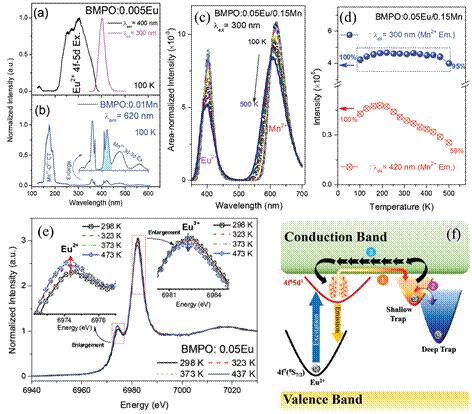 图3. (a) Eu2+及(b) Mn2+单掺杂BaMgP2O7样品的真空紫外-紫外可见低温激发光谱及发射光谱;(c) 300 nm激发下Eu2+-Mn2+共掺杂样品的温度依赖发射光谱;(d) 不同激发波长下共掺杂样品中Mn2+发光强度受温度影响的变化趋势;(e) 不同温度下Eu2+掺杂样品的Eu L3边XANES谱;(f) 热致缺陷捕获电子重释放过程引起Eu2+发光强度随温度上升增强示意图。