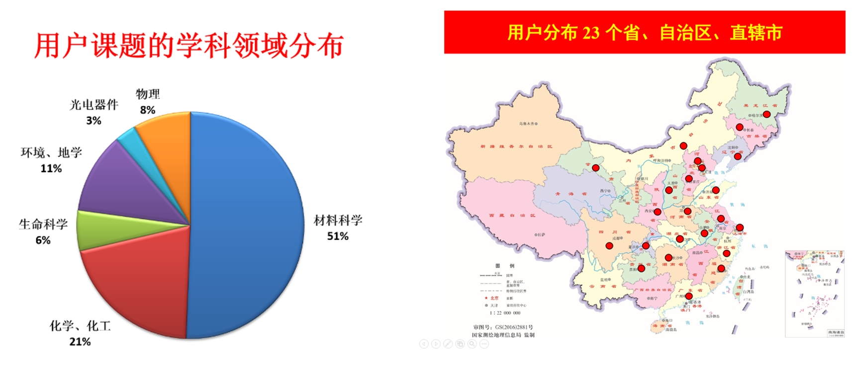本次开放运行用户课题的学科领域分布示意图(左)及用户分布示意图(右)