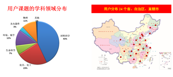 本次开放运行用户课题的学科领域分布示意图(左)及用户单位分布示意图(右)。