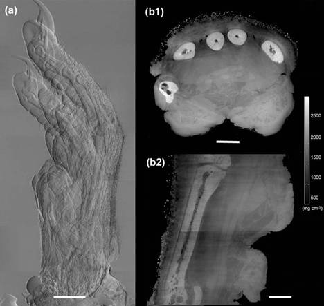 附图.低剂量、快速X射线相位CT实验结果,样品为大鼠爪,(a)微分相位衬度投影像,(b1)轴位断层重建像,(b2) 冠位断层重建像。图像中不但可以看到骨头,而且可以看到肌肉甚至毛发。