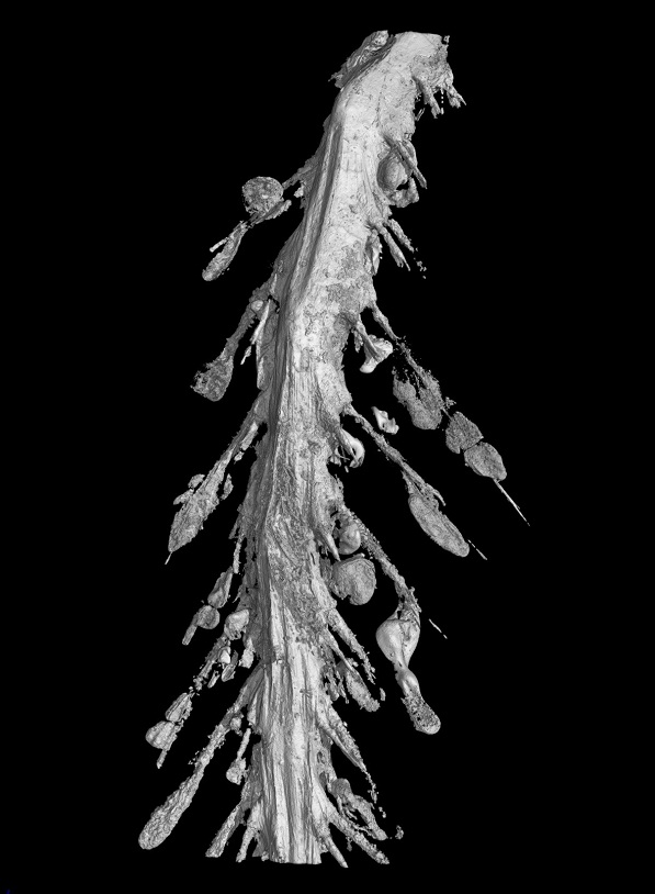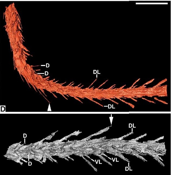 研究团队用BSRFSSRFSRX相衬成像装置无损获取了该化石多尺度分辨的高清投影图像,经过对投影图像的断层重建、数据分割、分段拼接和3D重构,得到了被羽毛和琥珀包围着的骨骼部分的高清3D图像,经分析揭示了该段骨骼的诸多3D形态特征,发现该化石属于非鸟虚骨龙类恐龙(coelurosaurs)的一段尾骨,包括至少9段尾椎,骨骼形态(如腹侧明显的沟槽结构)与典型的非鸟虚骨龙类恐龙类似,明显区别于典型的古鸟类。