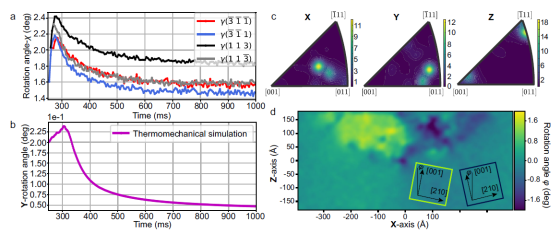 单晶高温合金相比多晶材料具有更好的高温强度、抗蠕变和抗疲劳性能,广泛应用于航空发动机及燃气轮机涡轮叶片等。增材制造技术不仅可以对单晶叶片进行修复,在单晶叶片的制造领域也展现出巨大的应用前景。金属增材制造过程是典型的超快、动态、非可逆过程,HEPS结构动力学线站建设团队基于BSRF开发了金属增材制造原位表征平台,利用时间分辨Laue衍射技术,动态捕捉到镍基单晶外延生长过程中的瞬态晶体转向和杂晶生长过程,解决了传统手段无法原位表征增材制造“中间过程、内部结构”的困难;并结合有限元模拟及分子动力学仿真,揭示了高斯光束不均匀加热所带来的局域变形、与晶体转向及杂晶形核之间的内在联系,为航空发动机单晶叶片激光增材制造及修复过程中晶体取向控制提供了重要理论依据。