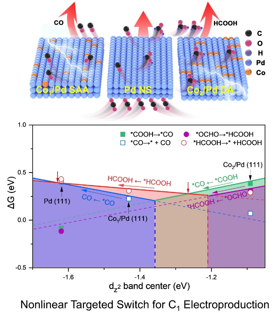 构建用于CO2电转换的靶向开关,对于定向获取高值化学品以实现“双碳”战略至关重要,但是目前活性位点的对称性及拓扑结构与催化性能之间缺乏普适关联性,严重阻碍了对多种中间体竞争性路径的精准调控。本工作中,团队基于前期对局域对称性破缺单原子催化剂用于高效CO2电还原产甲酸(Nat. Commun. 2023, 14, 6849ESI高被引论文)的研究,采用原子植入策略,在金属钯烯上成功构建了用于C1产物选择性切换所需的非线性靶向开关Cox/Pdx=1, 2)。从Co1/Pd切换到Co2/Pd,可使C1产物(CO和甲酸)选择性发生非线性、高对比度翻转(选择性均超过94%),而且在工况电流密度(-150 mA cm-2)下连续工作200小时仍能保持优异的选择性和电流效率。原位谱学和理论计算发现特定的近邻金属位点组合能够调节dz2能带中心,诱发中间体优先吸附构型的非线性切换,进而控制C1产物的转化路径。该研究揭示了一种用于C1产物高选择性转换的理想开关,为通过特定拓扑结构组装来精细调控能量转换过程提供了新视角。高能所博士后裴加景、张贵凯和中国计量大学李灿为论文共同第一作者,高能所为唯一通讯单位,董俊才特聘青年研究员为论文通讯作者。