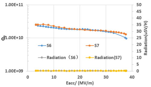 研制完成的两只1.3 GHz单cell超导腔(编号PAPS-HTF-1300-S006和PAPS-HNF-1300-S007),2K垂直测试下加速梯度Eacc达到37MV/m,对应Q0约为1×1010;在16MV/m梯度下Q0约为1.9×1010。这是在国内加工及电抛光工艺后处理后加速梯度最高的,其性能与国际先进水平持平。两只超导腔测试梯度和Q值基本一致,说明研究团队摸索和创建的超导腔的研制工艺和电抛光处理工艺稳定,质量控制取得了显著的效果。在超导腔垂直测试过程中均无明显辐射剂量,也标志着洁净组装技术达到国际先进实验室水平。
