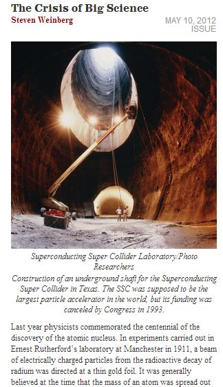 1979年诺贝尔物理学奖获得者,美国物理学家史蒂文•温伯格(Steven Weinberg)在2012年5月10日的《The New York Review of Books》上发表了“The Crisis of Big Science”。他在文中指出:
