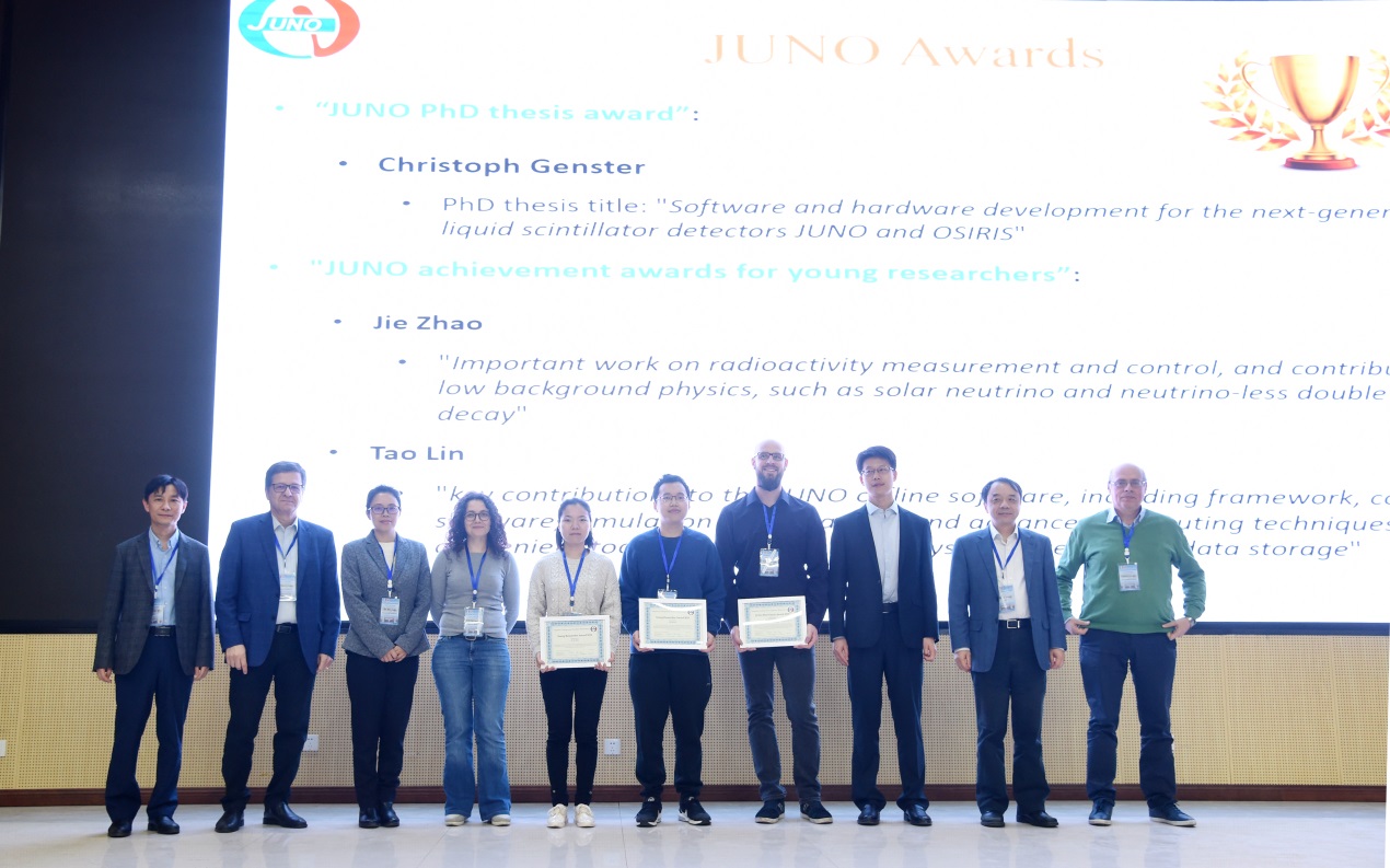 在第13届合作组会上决定设立江门中微子实验“博士论文奖”和“青年科学家奖”,旨在提升优秀青年人才。高能所林韬副研究员和赵洁副研究员分别因在软件和低本底研究中的突出贡献,获得了2019年度“青年科学家奖”。“博士论文奖”则由德国图宾根大学的Christoph Genster获得。合作组会期间举行了颁奖仪式。