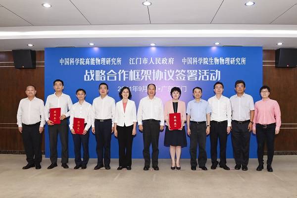 9月2日,中科院高能所与广东省江门市人民政府在江门签署战略合作协议。江门市委书记陈岸明、市长吴晓晖与高能所所长王贻芳一行出席了协议签署仪式。