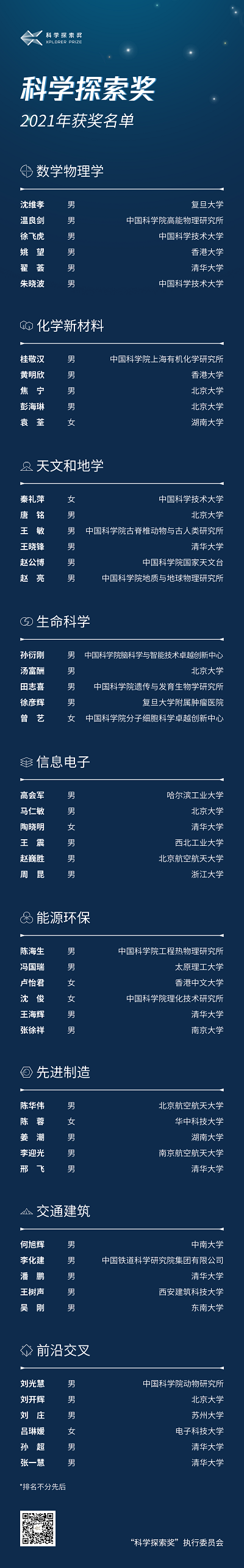 据“科学探索奖”项目负责人介绍,在2021年奖项的提名、推荐、评审过程中,有超过800位各国院士及20多所著名高校校长参与其中。仅在提名推荐阶段,就有20多位诺贝尔奖、图灵奖、菲尔兹奖等国际大奖得主参与。