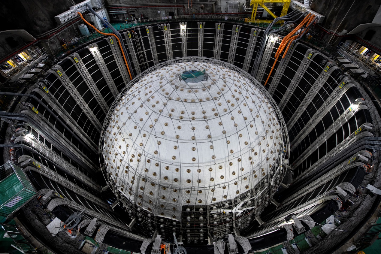 近日,江门中微子实验中心探测器内部有机玻璃球最后一个拼装单元合拢就位,标志着直径35.4米的世界最大的单体有机玻璃球已经全部建成,实验进入最后的收官阶段。