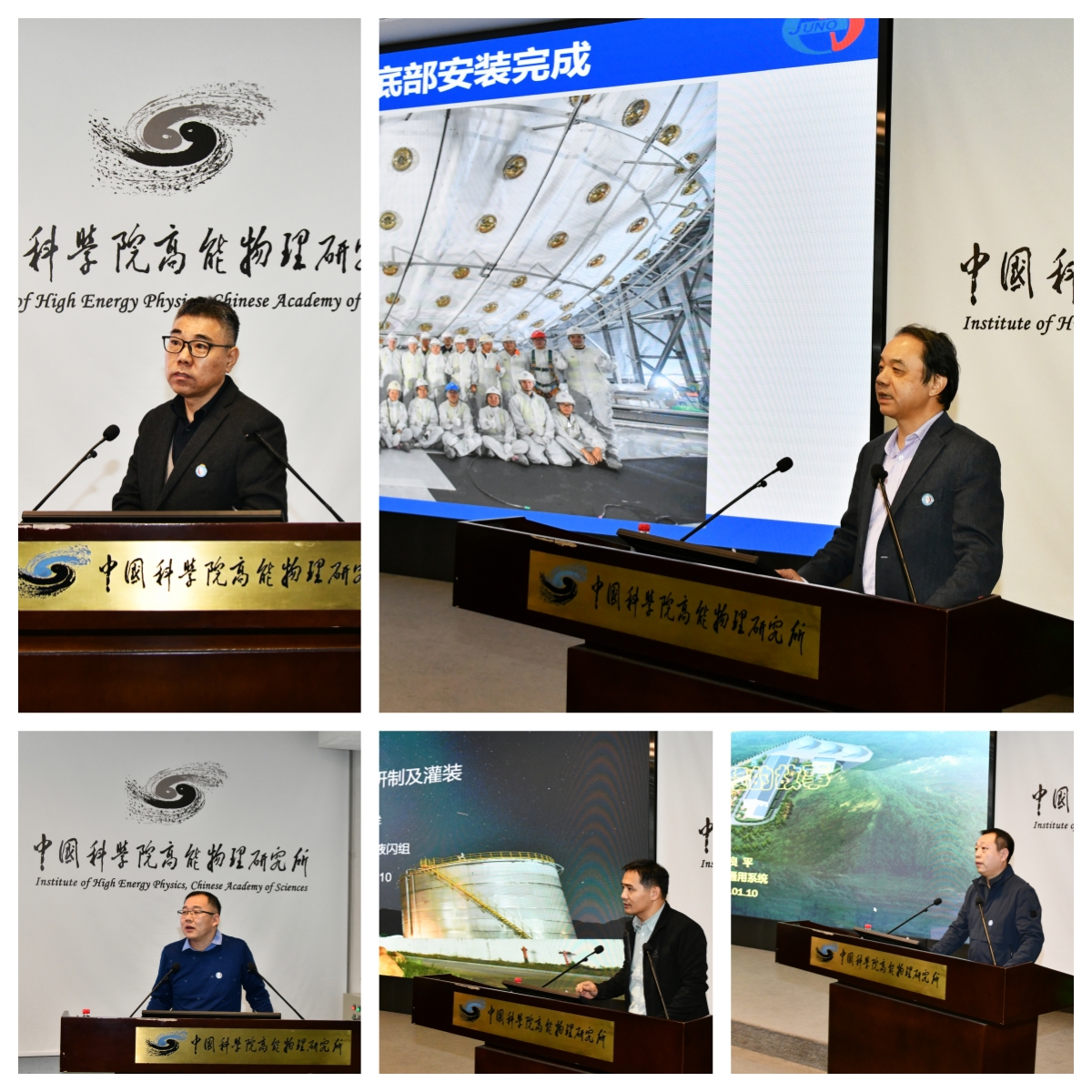 在专题分享环节,由JUNO项目的四位核心成员,报告项目中的关键技术攻关和工程挑战。JUNO项目副经理、中心探测器负责人衡月昆研究员分享了JUNO中心探测器的设计和安装的历程和困难及团队如何解决这些难题,并最终建成世界上体积最大、能量分辨率最高的液体闪烁探测器的故事。JUNO光电倍增管测试与防护系统负责人秦中华研究员则讲述了JUNO实验的关键设备光电倍增管,从研制到测试和安装过程的经历。为了实现实验设计要求,团队解决各种难题,与企业合作打破国际垄断实现国产化,江门中微子实验室采用的光电倍增管,不仅研发了世界上效率最高的产品,通过了包括中国、欧盟、美国、日本在内的多国专利认证,还为JUNO量身打造了防爆系统以及电子读出系统等。经过一系列严格的测试后,四万多支光电倍增管现已被精确安装于中心探测器的不锈钢壳上,成功实现数据获取。JUNO液体闪烁体研制子系统协调人俞伯祥分享了为JUNO量身打造的低放射性、高洁净度、高效率的液闪纯化系统及其研发过程中遇到的各种挑战。2万吨液闪从地面经历诸多步骤,一直到地下液闪厅,最后灌装进直径35.4米的有机玻璃球内,JUNO开发了多个独特的系统,达到了极低本底和极高透明度的要求,保证了探测器的能量分辨率。最后,JUNO配套基建项目主管阎良平工程师分享了十年来项目基建遇到的一个个难题。JUNO集合国内顶尖的设计、施工、监理、设计及造价咨询团队,经过十年的艰苦奋斗,总结并开发出一种适用于深埋且超大跨度的地下洞室的多工艺、多层次综合施工方法;同时还开发了一个大型跨度地下洞室的稳定性预警和评估系统,有效地解决了深埋、富水工程项目的施工挑战。