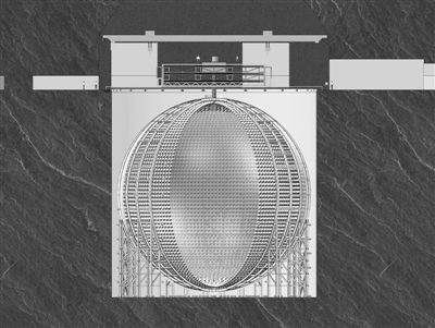 江门中微子探测器示意图:球形的中微子探测器置于水池中心,上下与四周均被2米以上的水包围以屏蔽本底,在水池顶部采用径迹探测器作为反符合探测器,钢网架上安放光电倍增管以探测中微子。