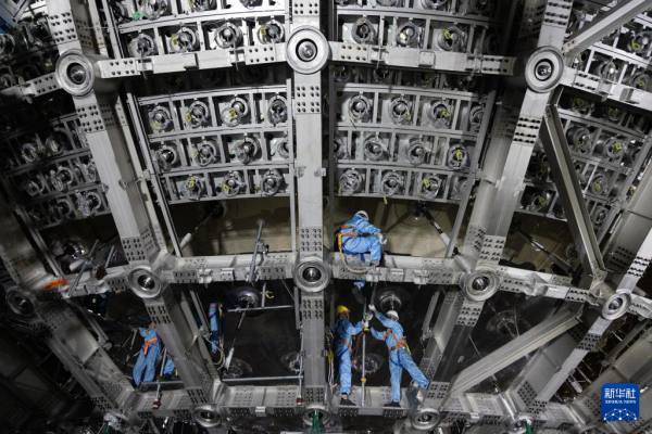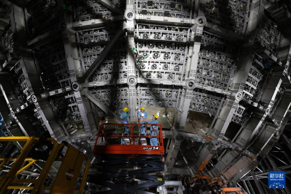 10月10日,工人在中心探测器不锈钢网架上施工。新华社记者 金立旺 摄