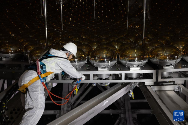 10月9日,江门中微子实验光电倍增管测试与防护系统负责人秦中华在检查倍增管安装情况。新华社记者 金立旺 摄