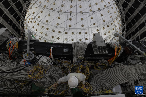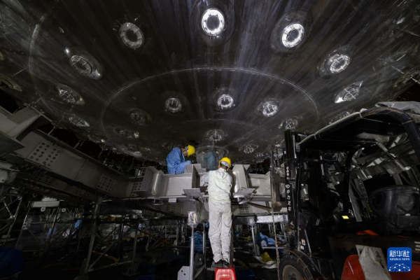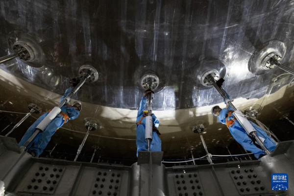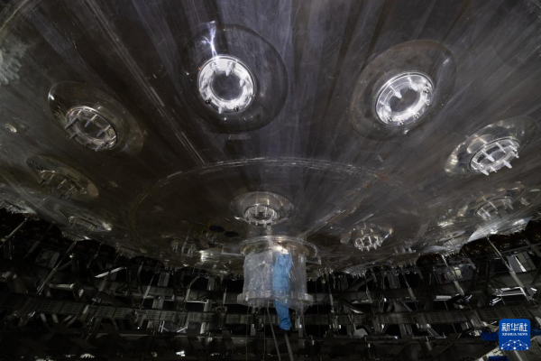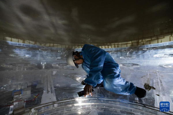 10月9日,工人在检查中心探测器最内层的有机玻璃球施工情况。新华社记者 金立旺 摄